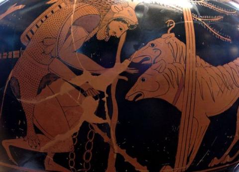 Kerveros was son of Tyfon and Echidna and the dog of Hades. Plouton put him in front of the gates of Hades as guardian in order not to leave the dead to come out. He was a very wild beast and he had three heads or according to others fifty or one hundred. For hairs he had snakes and his tail was a tail of dragon with a head at the end. His voice was terrific and analogous to his appearance and that's why Hesiodus describe his voice as “chalcophonous” (=with copper voice).