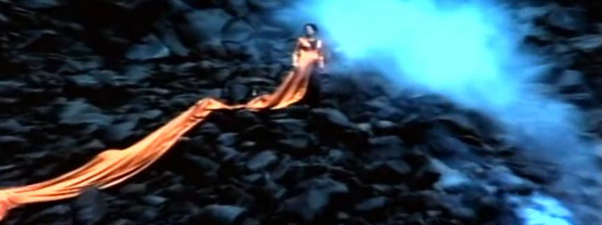 The scenes that follow show rocks (earth realm, Hekate Chthonia) and sea (water realm, Hekate Einalia), the two out of three realms that the Goddess has power and dominion. Among the mountain tops a smoke starts to appear, which is caused from a volcano eruption. Maybe here, the volcano is the third realm, of the Underworld. After the explosion of the volcano, the singer appears in a long orange-saffrom dress, a color which reminds us of Hekate from the Orphic hymn. We see her on top of a mountain invoking seeing the sea. She says: