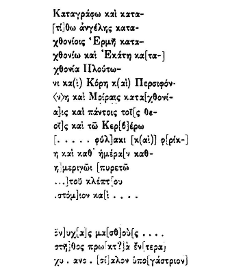 From Egypt only 15 lead tablets have been found, due to the use of papyrus, a material that was easy to obtain in Egypt. One tablet has a binding spell written by a woman who loved Eutyches. Three Gods are used to help in the binding. Nekydaimon, the spirit of a dead, Abraxas, a God mainly invoked by Witches and Adonai, the christian God. This was very common in Witchcraft methods of hellenistic and roman area. In another lead tablet, Poseidonios is binding a woman who likes her, named Heronou. Chthonic Gods, associated with the dead are invokd like Ereshchigal, Hermes, Thoth and Anubis. Again, we notice the use of three different panthea. Spirits of the place are also invoked to bind the woman so that she will not like any other man, neither she will have any kind of sex with him. Voces magicae are also used, after the invocations. The help of a dead spirit is used in the end. In both cases the witches who use binding techniques are full in love. Professor Andre Bernard who has written The Grecs Sorciers and provides lots of information about curse tablets, he mentions that this word pattern is also repeated in other tablets from different places. He writes that there are at least five other tablets slightly different. According to this notice we can see that a witch school had been found and it was really active in roman period, especially concerning the fact that many tablets remain hidden and that papyros was used mainly in Egypt.