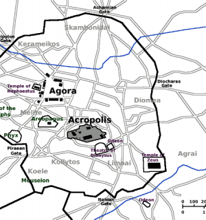 A triangle-shaped open air sanctuary is located just outside the southwest corner of the Agora in Athens. Its position at a crossroad and the triangular shape of its enclosure, the building is indicated to be a shrine of Hekate.