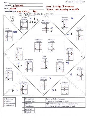 The last system we are going to see is Golden Dawn's Geomancy as it is taught in the 2nd degree of Zelator, attributed to the tenth sephira, Malkuth (earth, kingdom). The arrangement of the figures in the house chart is completely different from all the previous systems. The zodiac sign and the planetary arrangements are drawn from Agrippa, yet the zodiac correspondences are different from his. As you imagine the problem of having the same planet to more than one signs is considered "normal". The Golden Dawn searches for elemental imbalances, the essential and accidental dignities the basic planetary aspects (opposition, trine, sextile, square) and lastly the power of the planets (exaltation, triplicity, fall and detriment).