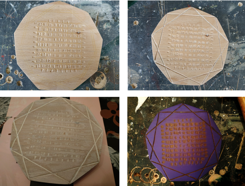 I cut the wood with a hand saw in the shape of a hexagon. I decided to make the backside passive, so I used the router to cut the edges of the wood in a triangular shape, which is more pleasant to the eye and gives depth to the front side. I used a chisel to trace the hexagram and the seal of the Moon. For the letters, I used iron cast hammered letters. I also tried to make the lines with the chisel, but due to the vertical lines of the beechwood (it is a hardwood), I couldn't do it. I also used the Dremel, but I had the same problem. Initially, I painted the wood silver, but I didn't like the result, so I sanded it again and I used violet. The flashing color was another big problem. I tried my brushes, but I couldn't do it. Not to mention, that the violet was inside the letters and I couldn't paint them with gesso and then with the yellow color, because the layers filled the embossed letters. So, I used a colored marker. I dried the paint with a hairdryer and then I passed two layers of polyurethane gloss varnish.