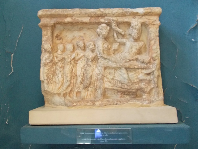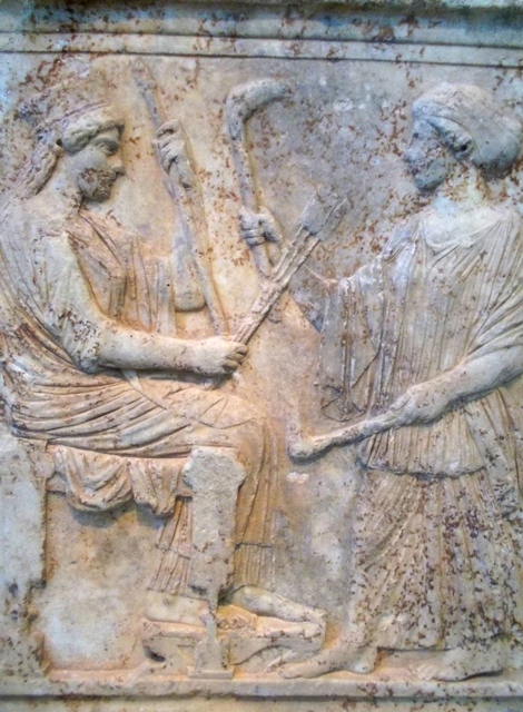 Anaglyph stele. Demeter sits and talks with her daughter. Another opinion is that we see Demeter with Hekate. It was found close to larger propylaia. Height: 0.78 meters width: 0.56 meters