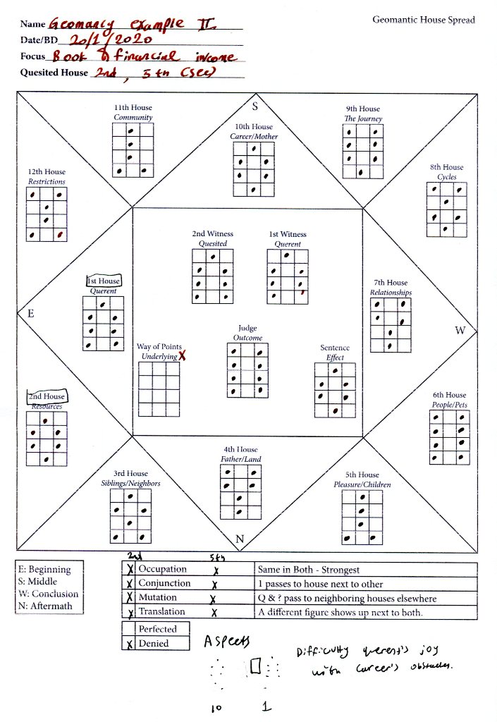 From the quick view, I wouldn’t proceed to the house chart, as the shield chart implies not to expect much from the writing. The judge, the sentence, the house of the quesited and even the 5th house do not show any hints of a good result. It’s an easy reading for the geomancer, yet it is not easy how he will express the result to his client.
