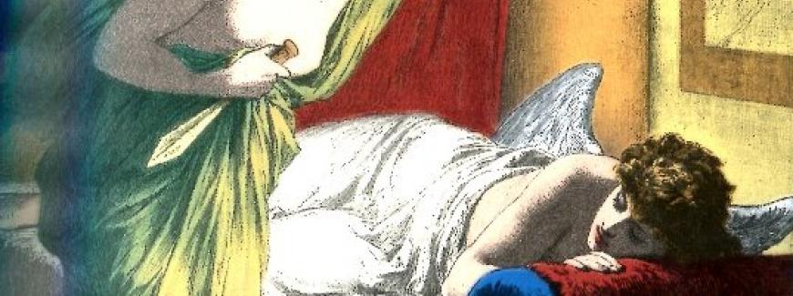 During the night, she took the lamp to see her husband, and instead of a snake, she sees an angel with wings. She sees Eros, the child of Aphrodite and the god of love. No monster, no snake, only a beautiful god. She hid the razor to her chest. She saw the arrows and as she examined them, she cut herself, so she started to fall deeply in love with Eros. She kissed him to his body and one drop of oil fell into his shoulder. The young god wakes up, realizes what happened, and leaves.