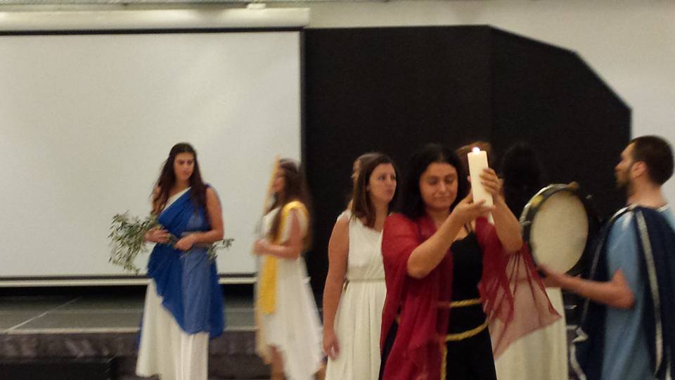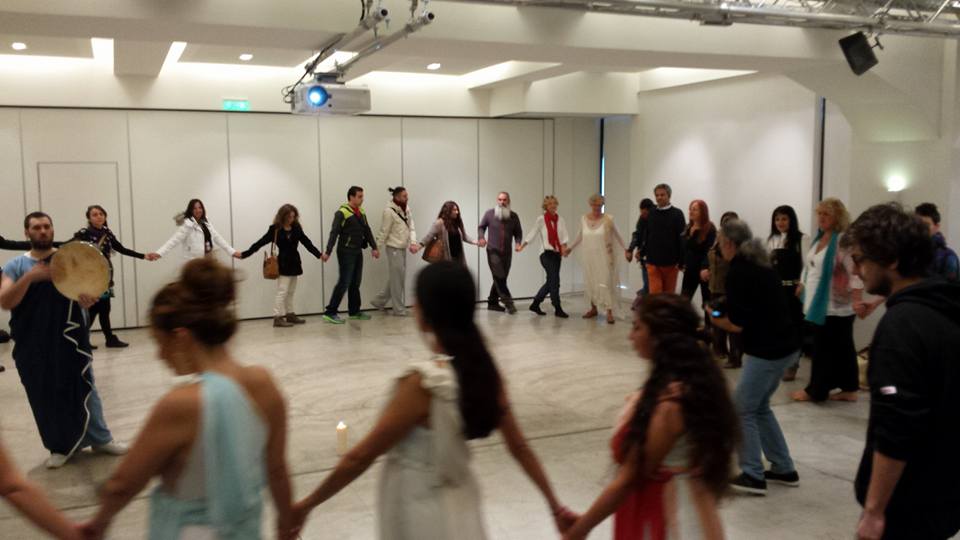 Let's talk about what happened on November 1rst. At 10:30 a theatrical based ceremony started outside the building. The girls were dancing under the flute and they were dressed up representing each one a female Goddess from the hellenic pantheon. They walked inside the building were Sorita take over and with a candle in her hands she invoked all the Goddesses who were invoked in the past in Athens and she asked their help using simple ritual acts. We all formed a circle and moved deosil. She was very nice to all and she opened herself to questions, photos and she tried the flute too.