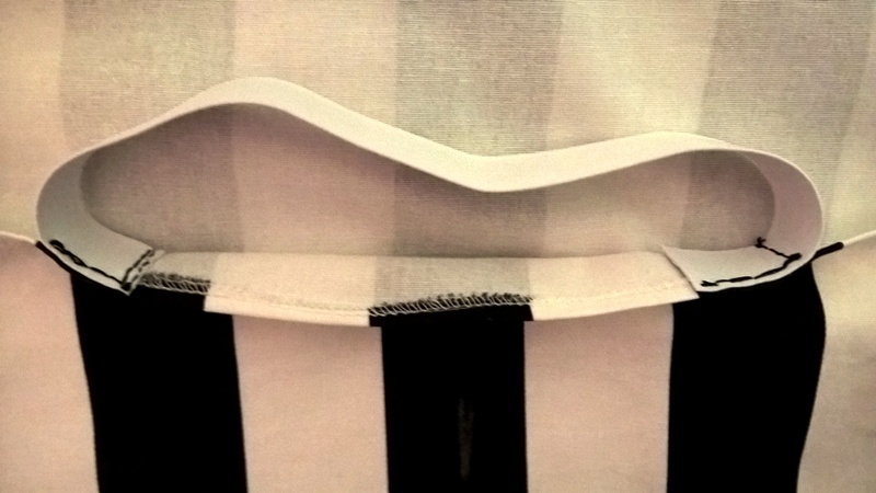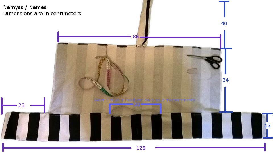 For making a nemyss you should find a piece of fabric with white and black stripes running down vertically. I have found one with stripes of 5 cm width each. It is the perfect pattern. The other thing you will need is sturdy white and black thread, needles to sew, scissors and a white elastic piece 2.5 cm width. To keep it simple, I have written all the dimensions in the following image. Happy sewing. If you have a hard time in making the nemyss or nemes, contact me to make it for you.